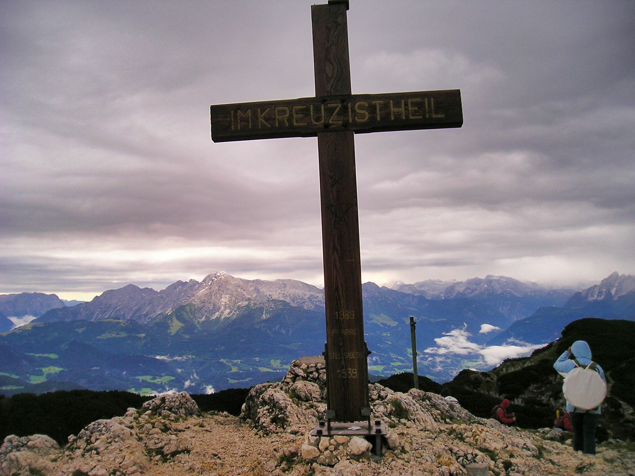 Am morgen des 15. August fuhren wir mir der Seilbahn auf den Untersberg und stiegen über den Salzburger Hochthron hinüber Richtung Mittagsscharte. Es war kühl, windig und regnete sogar etwas. Am Watzmann zeigte sich Neuschnee.