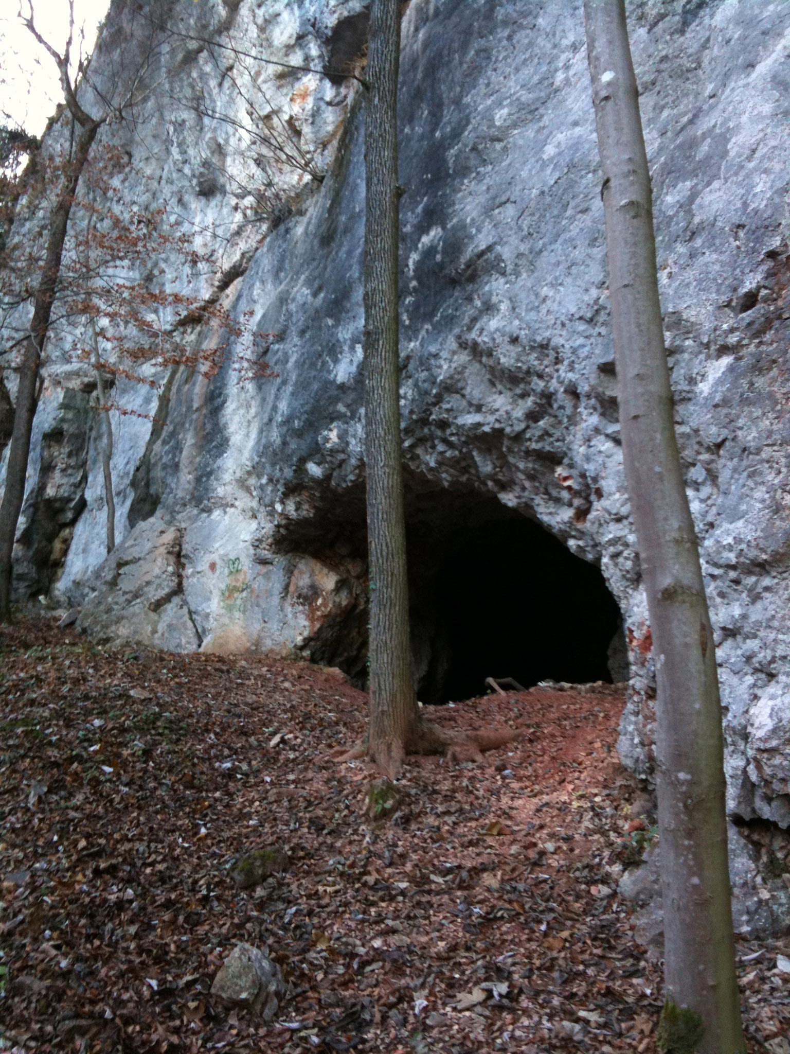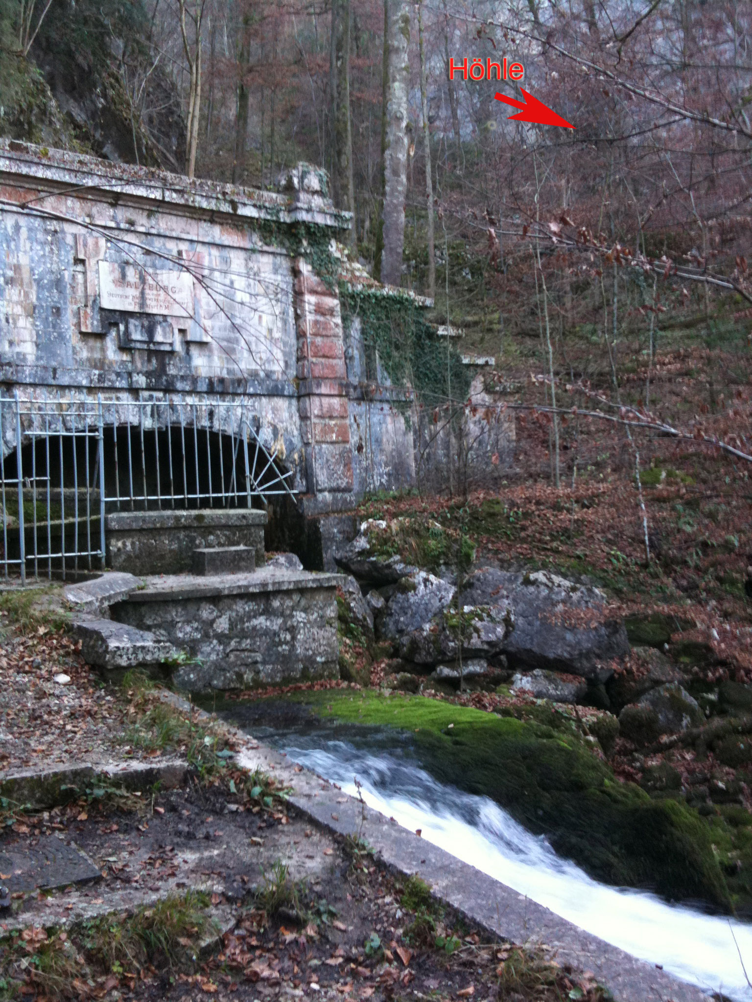 Den Quellenbau hinten auf einem Pfad überqueren, über eine große umgefallene Buche steigen. Rechts oben am Fuße der Felswand findet man den Eingang.