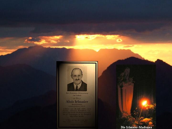 1978 stellte ein weiterer Visionär der Bioregion Untersberg, Dr. Eugen Köberle, die - inzwischen als Irlmaier-Madonna - bekannte Madonna bei der von Köberle entdeckten Quelle in der Almbachklamm zu Füssen des Berchtesgadener Hochthrons auf. Er schuf damit nicht nur ein Quellheiligtum sondern setzte damit auch Irlmaier ein Denkmal. Diese Madonna war einst in persönlichem Besitz Irlmaiers, der sie an seine Familie vererbte, die wiederum sie an Köberle schenkte.