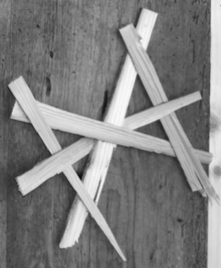 (siehe Grafik links) auf die Bretter unter dem Strohsack malt oder mit Spaltholz vor alle Außentüren ein Schrattgatter (siehe Grafik rechts) stellt. Es soll geweiht sein.