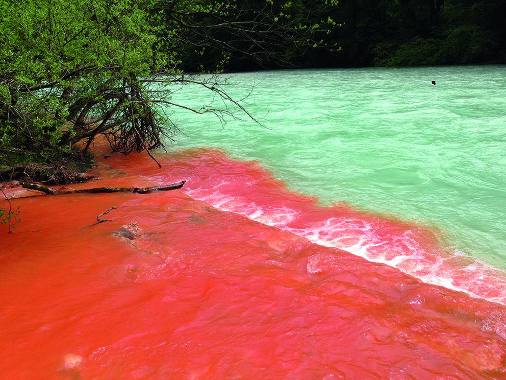 (Felssturz und rot eingefärberter Weißbach im Frühjahr 2015)