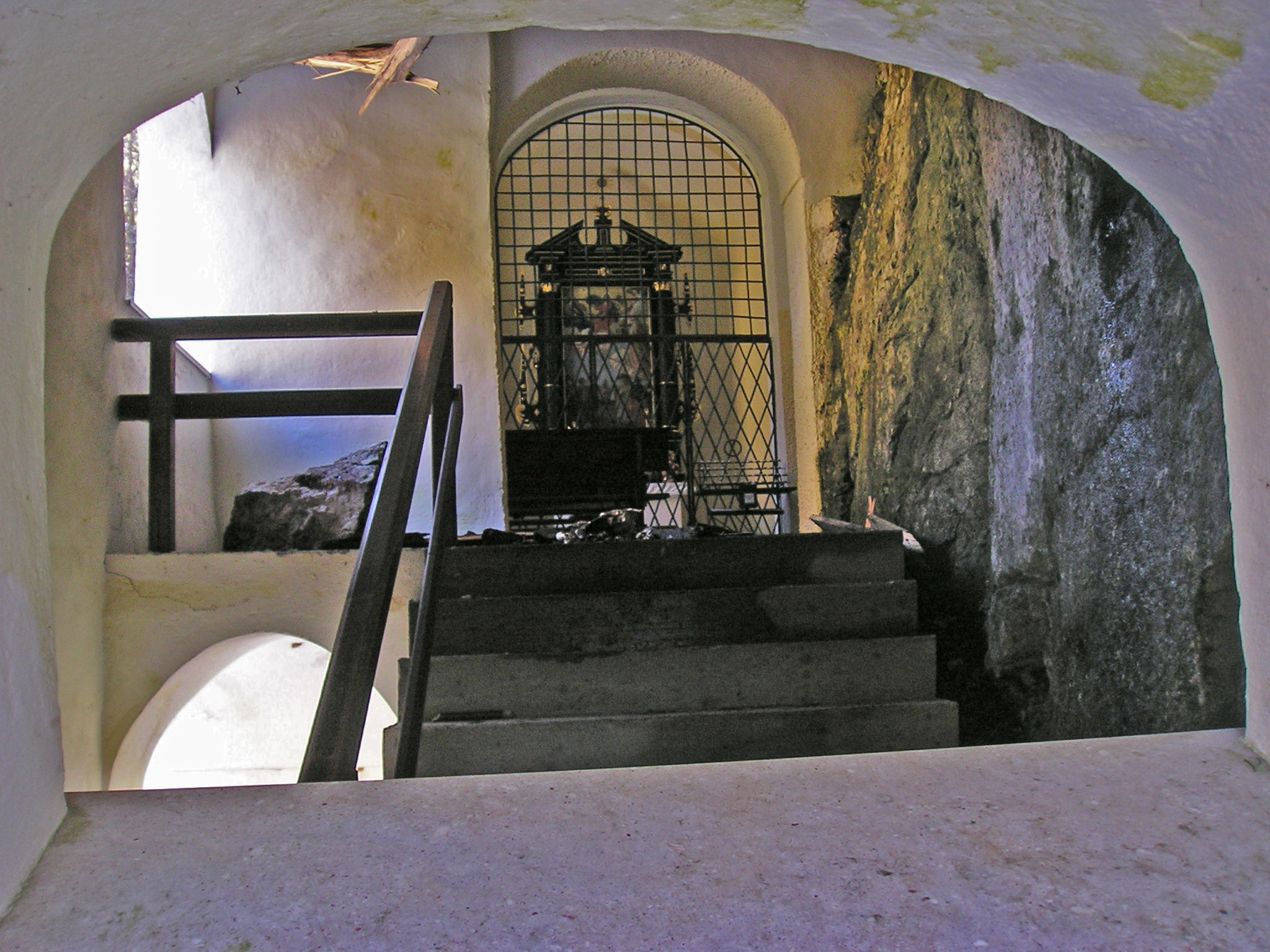 Am Ende der Linie liegt die Kulthöhle in der Wolfgangs-kapelle mit ihrem Spaltfelsen. Dort kam es im März 2008 zu einem Felssturz. Ein mächtiger Felssturz stürzte damals durch (!) das Kirchendach und kam im Inneren vor dem Altarraum zum Liegen. (siehe Fotos unten)