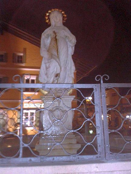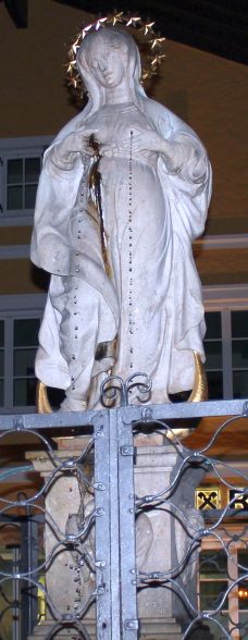 Im Herbst 2015 “blutete” die Brunnenmadonna von Großgmain. Es wird vermutlich eine ganz natürliche Erklärung durch Oxidation oder andere chemische Prozesse geben. Entscheidend ist jedoch eher die Bedeutung als ein Zeichen. Die Brunnenfigur am bedeutenden Kraftort und Kultplatz Marienkirche und Marien-heilgarten Großgmain ist eine sogenannte Maria Lactans aus deren Brust das lebensspendende Wasser fließt und zudem eine doppelgestaltige Maria (segenspendend und segenempfangend). Foto. Elke Wendt - Die blutende Brunnenmadonna ![]() Dieses Unikat aus Untersberger Gestein “blutete” von 1. November 2015 (Allerheiligen / Samhain) bis zum 15. November 2015 (Volkstrauertag). Bedeutsam ist der Erscheinungszeitraum zu jenen wichtigen katholischen Gedenk- und Feiertagen. Bedeutsam ist das Auftreten ein halbes Jahr nachfolgend zum “blutenden Berg” . Bemerkenswert auch, dass der “blutende Berg” den Weißbach im Süden des Untersbergs rot einfärbte. Jener Weißbach bei Marktschellenberg ist auch als Grenzbach (Österreich/Deutschland) bekannt. Großgmain liegt im Norden des Untersbergs wiederum an einem Weißbach, der ebenfalls als Grenzbach bekannt ist. Das Foto vom letzten Abend der Erscheinung (siehe Foto von Jenny Hoffmann unten) zeigt die Madonna in einem merkwürdigen Strahlenkranz, der auf 3 verschiedenen Fotos gleich zu sehen ist. ![]() | ||||