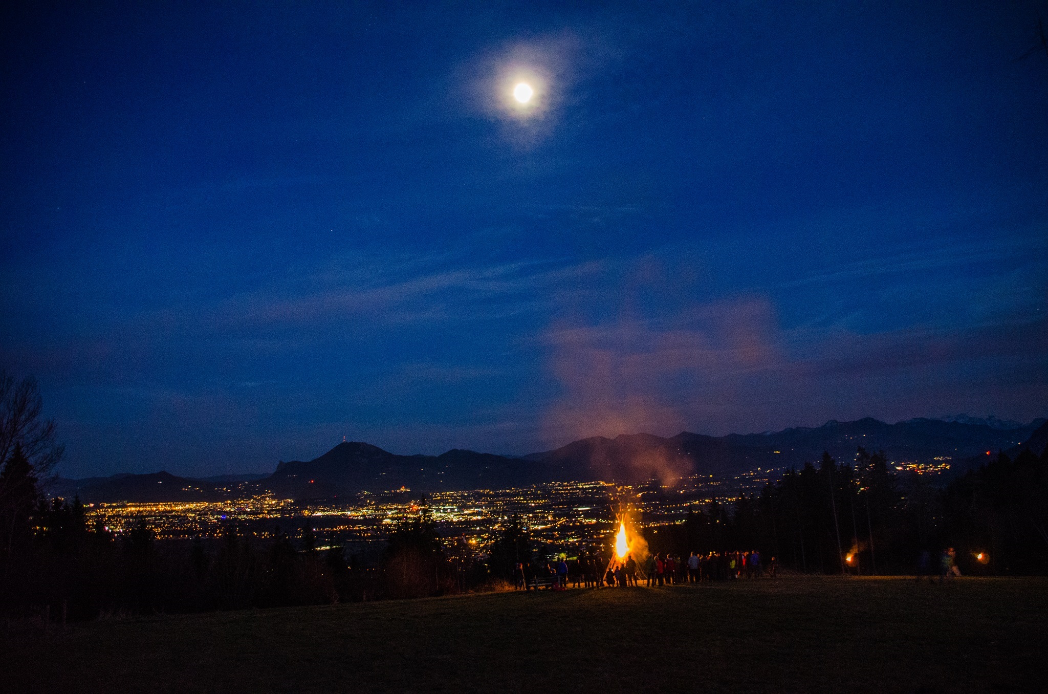 Die keltischen Alaunen (500-15 v.Chr.) haben aufgrund des Salzvorkommens hier im Reichenhaller Becken gesiedelt. Ein Relikt jener Epoche finden wir bei dem gemauerten Brunnenschacht - einem Kultschacht (Foto 2), der sich daher außerhalb der Kirchenmauern befindet. Auf dem Johannishögl, wo in heutigen Zeiten die Sonnwendfeuer (Foto 3) und auch Samhainfeuer lodern, wurden in vorchristlicher Zeit an den wichtigen Jahreseinschnitten des Sonnenjahres, den beiden Tag- und Nachtgleichen und an den beiden Sonnwendpunkten, Feuer entzündet.