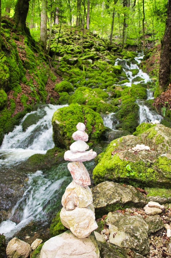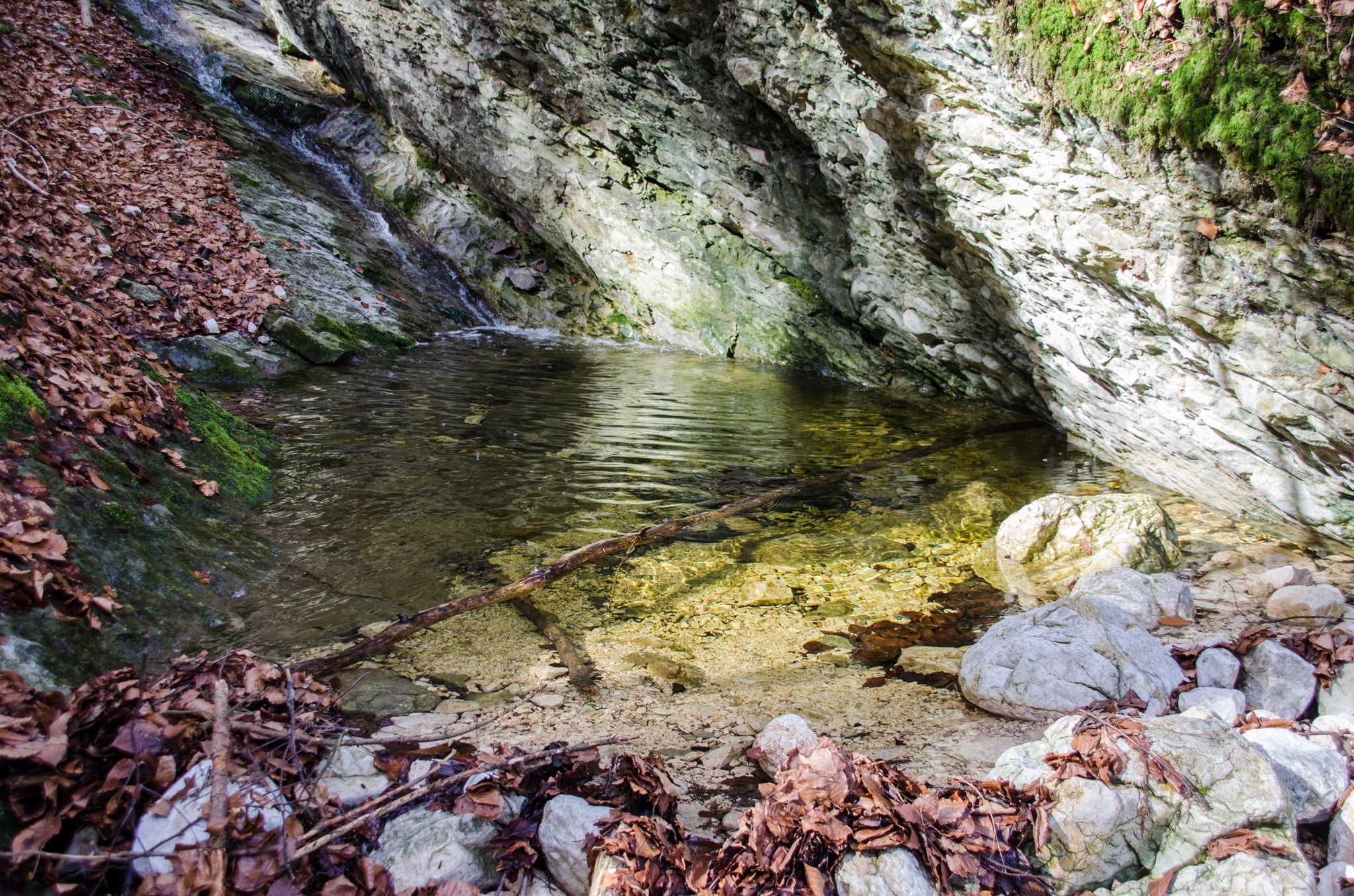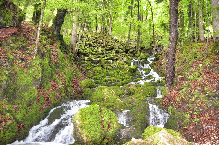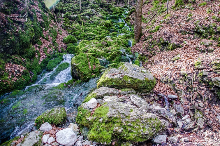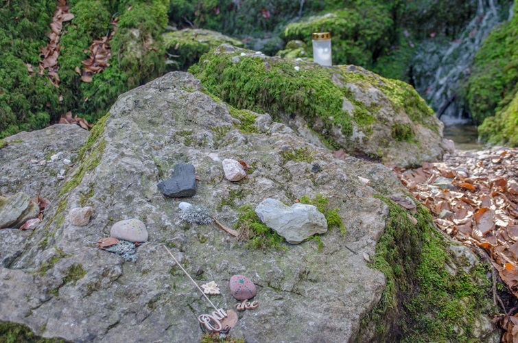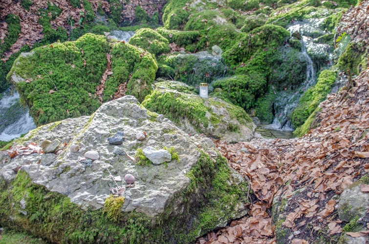 Unten, am Fuß der Kaskaden, fließt aus einem Rohr das heilkräftige Wasser, das von vielen Menschen der Umgebung gern aufgesucht und abgefüllt wird.